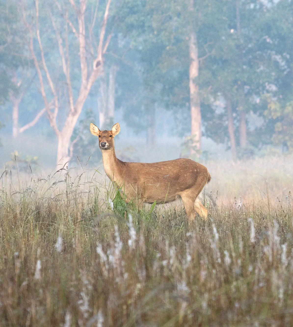 Winter settles into Kanha slowly, almost as if the forest is preparing for a performance. The mist begins to rise from the waterholes at first light, drifting gently across the sal forest. As the morning grows colder, a thick layer of frost forms on the grass, turning the entire meadow into a sparkling white carpet. On a good chilly winter morning, you can even see the whole grassland covered in frost. The landscape of Kanha changes.